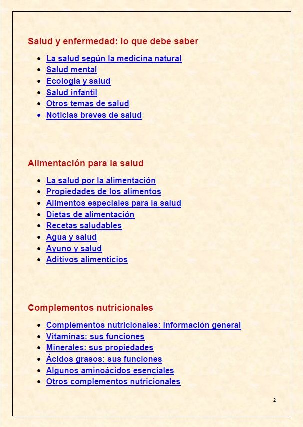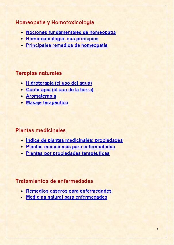 Esta colosal obra acumula todo tipo de información sobre tratamientos de medicina natural, consejos prácticos para la salud, remedios caseros, alimentación saludable, dietas, recetas de cocina, complementos nutricionales, plantas medicinales, homeopatía, terapias, etc. etc. El tiempo y la dedicación en su elaboración creemos que no tiene precio.