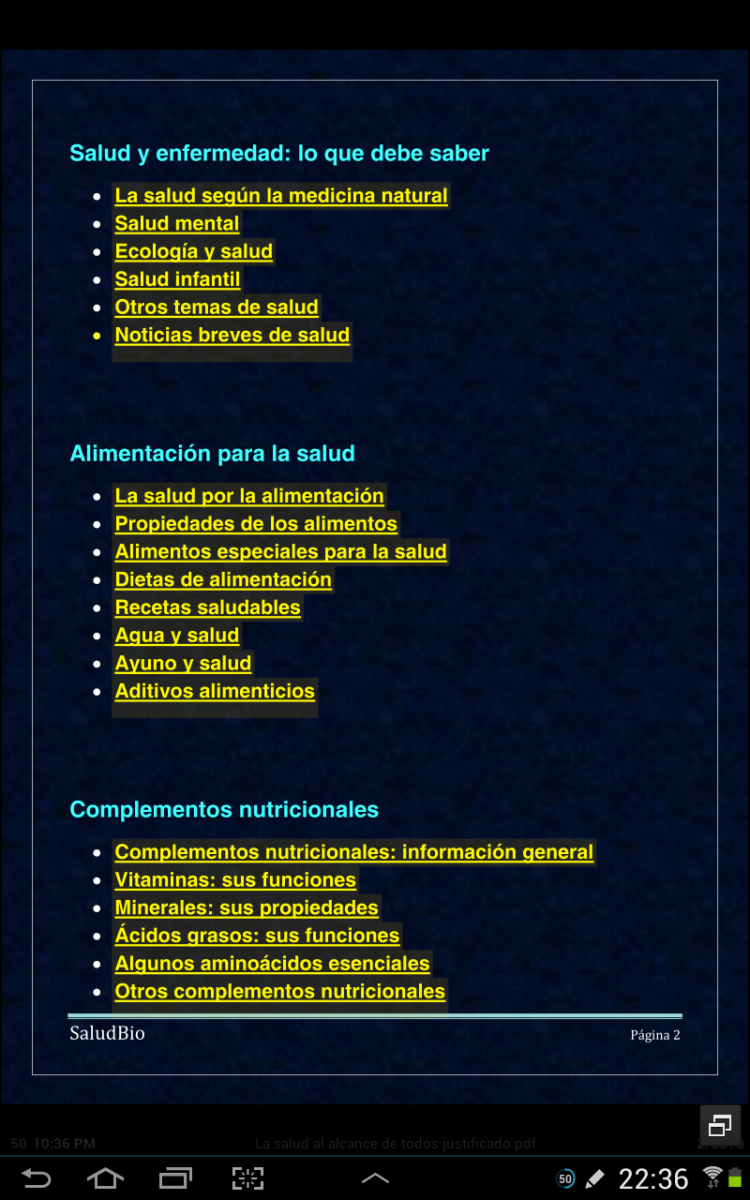 Aunque en SaludBio tenemos una excelente herramienta de consulta, hemos querido que la información más importante de nuestra web esté mucho más asequible a todo tipo de personas. Para ello hemos creado este eBook, libro, o mejor dicho, Enciclopedia de la salud en formato digital con sus secciones principales por separado.